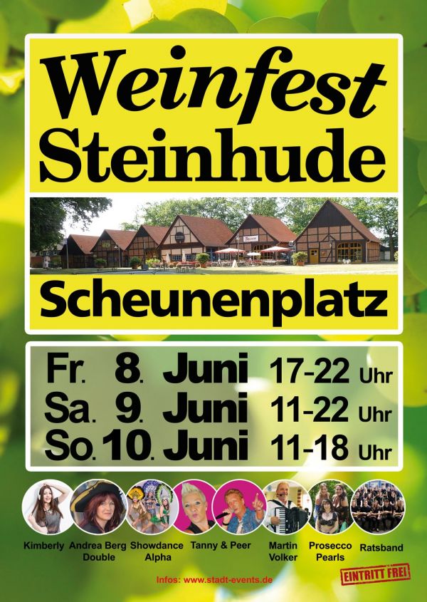 - Am zweiten Juniwochenende vom 08. bis zum 10. Juni 2018 präsentieren sich Winzer aus ganz Deutschland in dem historischen Scheunenviertel am idyllischen Steinhuder Meer und laden wie jedes Jahr zur Weinprobe ein. Mit der Sanierung des Scheunenviertels im Zuge der EXPO 2000 gelang die Rekonstruktion einer früheren dörflichen Anlage und macht diesen Ort mittlerweile nicht nur für Touristen zu einem beliebten Ausflugs- und Erholungsziel. Programm: Freitag, 08. Juni 2018 17:00 Uhr - DJ Herby 19:00 Uhr - Kimberly 20:30 Uhr - Andrea Berg Double Petra Schwar Samstag, 09. Juni 2018 11:00 Uhr - Eröffnung des Kunsthandwerkermarktes 14:00 Uhr - Weinprobe (Anmeldung erbeten) 15:30 Uhr - Accordionist Martin Volker 17:00 Uhr – Showdance Alpha – verschiedene Tanzrichtungen 18:00 Uhr – Prosecco Pearls – Orientalischer Bauchtanz 19:00 Uhr – It´s Foxxtime, geballte Schlagerpower mit Tanny und Peer Sonntag, 10. Juni 2018 11:00 Uhr – Eröffnung des Kunsthandwerkermarktes 12:00 Uhr – Ratsband Stadthagen