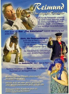 - Reimund der singende Reiseleiter freiberuflicher Berufmusiker als Alleinunterhalter unterwegs mit Musik im Gepäck deutscher Schlager -, Tanz-,Stimmungs- und Unterhaltungsmusik, einige gängige Oldys von der guten alten Zeit .Meine Instrumente : Keybord , Trompete und meine Stimme für den Gesang .Mein Kollege „LAP-TOP“ ist auch mit an Bord für die Discomusik oder Pausenmusik . ALOIS der lustige Feuerwehrmann ein kleines Unterhaltungsprogramm nach Comedy-Art mit Trompete , Gesang und Witze für Geburtstage ,Ständchenmusik als Programm und vieles mehr .. Dauer ungefähr 30 – 45 Minuten Aufwandsentschädigungen richten sich danach was gebucht wird und Fahrtkosten . Komme in jedes Bundesland , Bundesweit und auch Länderübergreifend .Referenzen vorhanden . Kontaktdaten : Reimund Götze ,Postfach 300151 ,03253 Doberlug-Kirchhain Telefon +Fax : ( Deutschland ) 035325 168349 Mobiltelefon : 0151 155 36 426 E-Mail : ReimundGoetze@t-online.de