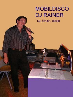 - MOBILDISCO DJ-RAINER. Der Profi für jedes Fest. Party - Tanz - Unterhaltung - Stimmung. Die Mobildisco für alle Festlichkeiten. Langjährige Bühnenerfahrung durch 100te Veranstaltungen, als DJ und Tanzmusiker. Musik ab den 50er Jahren bis hin zu den neuesten Hits. Alle Stilrichtungen der Disco und Tanzmusik. Die größten Hits der letzten 60 Jahre! Auf Musikwünsche wird stets eingegangen. Professionelle Ton und Lichtanlage mit Funkmikrofon das für Sie und Ihre Gäste zur Verfügung steht. Moderation. Dem Publikum angepasste Lautstärke. Für alle Altersgruppen die richtige Musik. Die musikalische Lösung für Ihr Fest. REFERENZEN: Geben Sie bei Google „showsternchen2“ ein und dann gehen Sie auf die Seite von „MyHammer“ und dort finden Sie Bewertungen die ich bei Veranstaltungen als DJ erhalten habe. Die Bewertung „Na ja“ war bei einer Punker-Hochzeit, das mir aber im Vorfeld nicht mitgeteilt wurde. Tel. 07142-62336 E-Mail: ra.gerhardt@gmx.de
