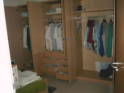 Ein großer Schlafzimmerschrank, ein Bett und ein Nachttisch