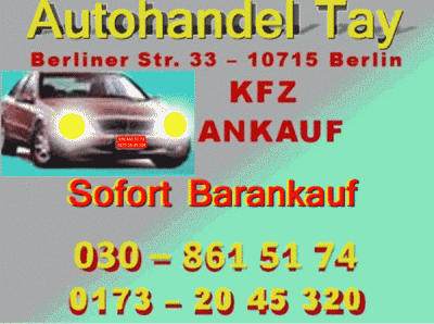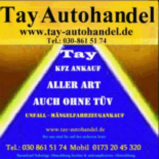 - TAY Autoh andel Berliner Str 33 / 10715 Berlin http://www.tay-autohandel.de Export Autoankauf von Gebraucht – Unfall – Mängelfahrzeuge Wir sind ständig auf der Suche nach Fahrzeugen aller Art! Pkws, Busse, Pick- Ups, Geländewagen, Firmenwagen, Nutzfahrzeuge Mit / ohne Tüv, Unfall und defekte, Mängel oder hoher km. Stand. Wir kaufen auch Autos und Nutzfahrzeuge verschiedenster Marken und Modelle von Privat und Firmen! möchten Sie Ihr Auto zu einem fairen Preis verkaufen ? rufen Sie uns einfach an! Tel.: 030 – 88 61 51 7 4 Mobil: 0173 / 20 45 320 (auch am Wochenende und außerhalb der üblichen Geschäftszeiten) Autohandel TAY Berliner Str 33 10715 Berlin - Wilmersdorf U - St.Nr DE 24 /201/ 64088 http://www.tay-autohandel.de