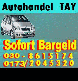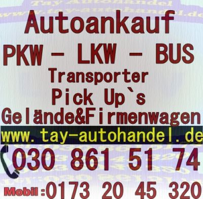- Export Autoankauf Berliner Str 33 - 10715 Berlin Wir kaufen ständig! Pkws, Busse, Transporter, Pick- Ups, Geländewagen, Firmen und Nutzfahrzeuge Auch ohne HU / AU, defekt, Mängel, Motor/Getriebeschaden,hohe Laufleistung sowie Unfallfahrzeuge aller für den Export Tel.: 030 – 861 51 74 Mobil: 0173 - 20 45 320 Mo. - Sonn. / Feiertage: 7:00 – 22:00 Uhr Wir kaufen Ihr Auto zum fairen Preis! Berliner Str 33 10715 Berlin E-Mail.:exporthandel@hotmail.de USt-ID Nr. DE. 20164088 Bei uns sind Sie auf der sicheren Seite www.tay-autohandel.de Gewerblicher Betrieb - Seriöse Abwicklung - Sofortige Abmeldung