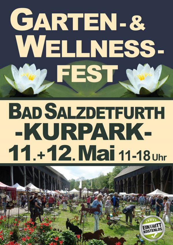 - Bereits zum zehnten Mal erstrahlt im Frühlingsglanz am 11. und 12. Mai das Garten- und Wellnessfest in Bad Salzdetfurth. Hierzu reisen deutschlandweit mehr als 70 Aussteller an, um mit neuesten Trends aus den Bereichen Garten, Wellness und Kunsthandwerk zu überraschen. Zwischen den 250 Jahre alten Gradierwerken und auf den Grünflächen im Park gibt es wieder viel zu entdecken. Bühnenprogramm: Samstag, 11. Mai 2019 - Kurparkbühne 11:00 Uhr Auftakt Garten – und Wellnessfest 13:00 Uhr Daniel Fernholz - Die besten Songs unserer besten Jahre! 15:00 Uhr MTV Bodenburg – akrobatische Tanzgruppen Sonntag, 12. Mai 2019 - Kurparkbühne 11:00 Uhr Beginn Garten – und Wellnessfest 13:00 Uhr Orientalischer Tanz, Anyana, Salima und Colors of Orient 15:00 Uhr Kurkonzert mit der Big-Band Dingelbe Ort: Kurpark Bad Salzdetfurth Adresse: Unterstraße 87, 31162 Bad Salzdetfurth Termin: 11. und 12. Mai 2019 Öffnungszeiten: Sa. und So. 11:00 bis 18:00 Uhr -Eintritt frei-