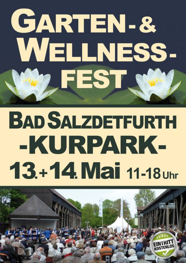 - Bereits zum achten Mal erstrahlt im Frühlingsglanz am 13. und 14. Mai das Garten- und Wellnessfest im Kurpark von Bad Salzdetfurth. Hierzu reisen deutschlandweit bis zu 80 Aussteller an, um mit neuesten Trends aus den Bereichen Garten, Wellness und Kunsthandwerk ein breites Publikum zu überzeugen. Zwischen den 250 Jahre alten Gradierwerken und auf den Grünflächen im Park gibt es wieder viel zu sehen und auszuprobieren. Anfahrt: Per Bahn Bahnanbindung Hildesheim - Haltestelle 'Bad Salzdetfurth-Solebad“ Per Auto Von Norden (Hannover) kommend: Autobahn A7, Abfahrt Hildesheimer Börde. Von Süden (Göttingen) kommend: Autobahn A7, Abfahrt Bockenem. Von Osten (Braunschweig) kommend: Autobahn A39, Abfahrt Baddeckenstedt (noch vor Dreieck Salzgitter). Veranstaltungsort: Kurpark Bad Salzdetfurth Adresse: Unterstraße, 31162 Bad Salzdetfurth Termin: 13. und 14. Mai 2017 Öffnungszeiten: Sa. 11:00 Uhr bis 18:00 Uhr und So. 11:00 bis 18:00 Uhr Eintritt: frei