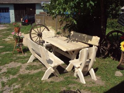 - Ich biete Ihnen eine sehr originelle , rustikale Gartenmöbelgarnitur, die aus Leiterwagenrädern hergestellt wurde. Die massive Garnitur ist sehr stabil, dank der entsprechenden Produktionstechnologie. Bestehend aus :1 Tisch + 2 Bänke , für 8 Personen , Garniturlänge 180 cm. verschiedene Längen und Breiten möglich, auch einzeln zu bekommen. Möbel sind aus solidem Erlenholz hergestellt. Sie wurden mit einer Holzlasur behandelt. Garnitur enthält 6 Räder , 2 große und 4 kleine , die nach dem alten Tradition hergestellt wurden. Unsere Vertretung ist: Herr Arkadiusz Czarnasiak 0048 886182254 0048 663264255 email biuro.arstol@gmail.com Sie können auch unsere Homepage durchsehen: www.e-moebel.net