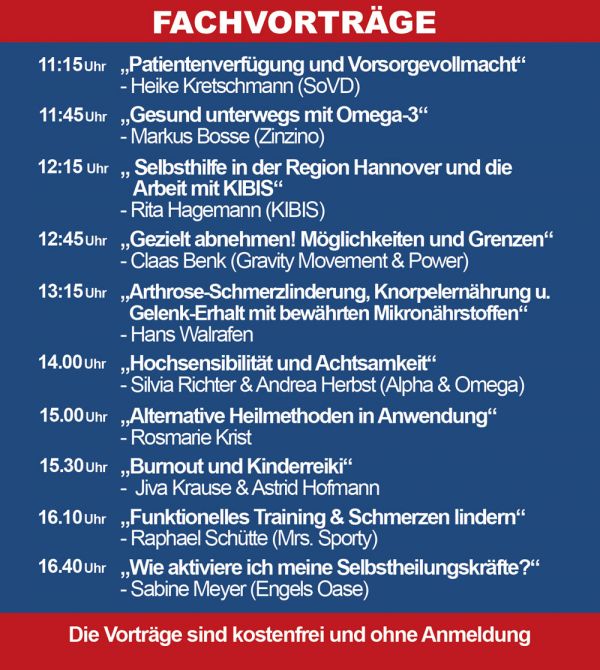 - Gesundheitstag Hannover am 08.09.2019 Am Sonntag, den . September findet von 11 bis 17 Uhr der zweite Gesundheitstag im Freizeitheim Hannover/Döhren statt. Gesundheit ist ein wichtiges Zukunftsthema. Die Menschen werden immer älter, sodass es wichtig ist, die Gesundheit und Vitalität möglichst lange zu erhalten. Vorsorge sollte daher schon frühzeitig beginnen und bis ins hohe Alter eine Selbstverständlichkeit sein. So befassen sich die Schwerpunkte des Gesundheitstages in Hannover mit Angeboten für Kinder, Erwachsene und Senioren und bestehen aus einer Vielzahl von Beratungs- und Dienstleistungsangeboten aus der Stadt unter anderem aus den Bereichen Fitness, Ernährung, Freizeit bis hin zu alternativen Heilmethoden, Stressbewältigung und Hilfen bei Volkskrankheiten. Parallel halten Experten ganztägig Fachvorträge zu unterschiedlichen gesundheitlichen Themen. Ort: Freizeitheim Döhren Adresse: An der Wollebahn 1, 30519 Hannover Termin: 08.09.19 Uhrzeit: 11-17 Uhr Eintritt: - frei -