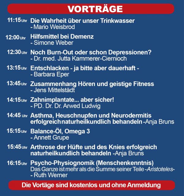 - Am 08. April 2018 wird zum dritten Mal der Gesundheitstag in der Holzmindener Stadthalle veranstaltet, um generationsübergreifend über alle Themenbereiche der Gesundheitsbranche zu informieren. Vor Ort finden sich Experten, Vereine und Ehrenamtliche aus Holzminden und Nachbarregionen ein und laden an den Ständen zum persönlichen Kennenlernen ein. An informativen Fachvorträgen zu Themen, mit denen sich fast jeder schon einmal beschäftigt hat, können die Besucher kostenlos teilnehmen. Der Eintritt der Messe ist frei. Veranstaltung: Gesundheitstag Holzminden Veranstaltungsort: Stadthalle Holzminden Adresse: Sollingstraße 101, 37603 Holzminden Termin: 8. April 2018 Öffnungszeiten: So. 11:00 bis 17:00 Uhr Eintritt: - frei