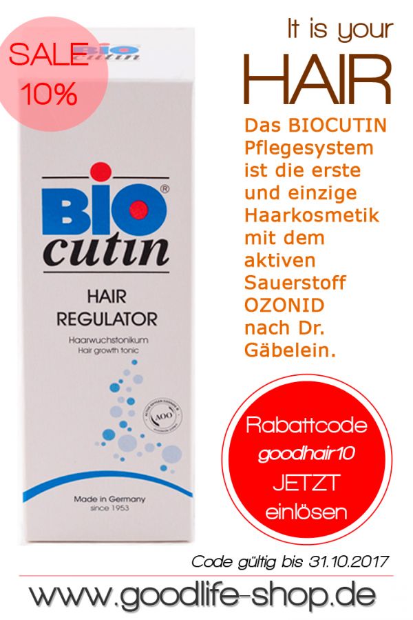 - Das BIOCUTIN Pflegesystem ist die erste und einzige Haarkosmetik mit dem aktiven Sauerstoff OZONID nach Dr. Gäbelein, in reiner biologischen Qualität. Der Biocutin Hair Regulator ist haarwuchsanregend, stoppt Schuppen und stoppt den Haarausfall. Biocutin Hair Regulator unterstützt problemlösend den Stoffwechselvorgang. Die Talgproduktion und Schuppenbildung werden reguliert. Die Regenerationsphase beginnt nach 4 bis 6 Wochen ab Kurbeginn. Schwache Haarwurzeln werden zu kräftigem Haarwuchs angeregt. Biocutin Hair Regulator reguliert den Zustand der Kopfhaut und das Haar wächst wieder gesund aus der Haarwurzel heraus. Sichere dir gleich jetzt 10% Rabatt bei goodlife mit dem Gutscheincode: goodhair10 für deinen 'Biocutin Hair Regulator' nur gültig bis zum 31.10.2017. Weitere Informationen auf unserer Webseite Info: goodlife-shop de Wir freuen uns auf Ihren Besuch.