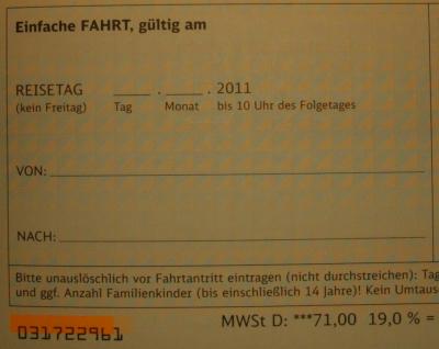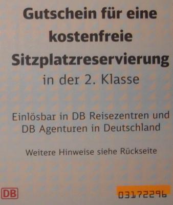 - Das hier angebotene Ticket ist auf jedem Fall noch zu haben! Ich lösche jede Kleinanzeige sofort nach dem Verkauf! mehrere Tickets vorhanden! ICE, IC/EC, ÖBB, SBB etc. Bahnticket nur 48,- jederzeit reisen innerhalb Deutschlands oder zwischen Deutschland-Österreich und Deutschland-Schweiz, wie sie es wollen (ausgenommen freitags). @ @ Einsteigen & losfahren! Einfacher geht Reisen nicht! @ @ Und so geht’s: Einfach vor Fahrtantritt den Startbahnhof, den Zielbahnhof und das Reisedatum (siehe Bild) in die dafür vorgesehenen Felder eintragen. Das ist alles! Kinder/Enkelkinder bis 14 Jahre reisen in Begleitung der Eltern, Großelternteils oder Lebenspartner KOSTENLOS mit. @ Gratis dazu: Gutschein für kostenfreie Sitzplatzreservierung im Wert von 4,50 Euro @ Gratis dazu: 0,3 Liter Zapfgetränk „siehe Coupon“ @ Die Tickets sind gültig vom 03.01.2011 bis 31.03.2011 SPAREN SIE! "Bahn Normalpreis" von Hamburg HBF nach: Graz - 180,80 Euro Genf - 177,00 Euro München - 129,00 Euro Sie zahlen NUR 48,00 !!! Tel.: 01578 - 922 30 64 kleinanzeige@habmalnefrage.de Versand möglich: per Einschreiben zzgl. 2,90 Abholung jederzeit: Hamburg Bergedorf, nähe S-Bahn Nettelnburg