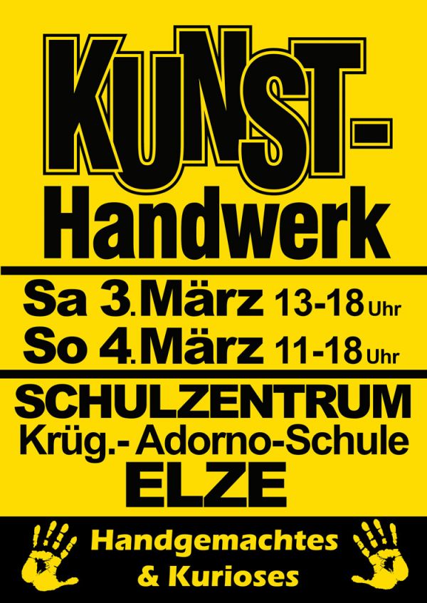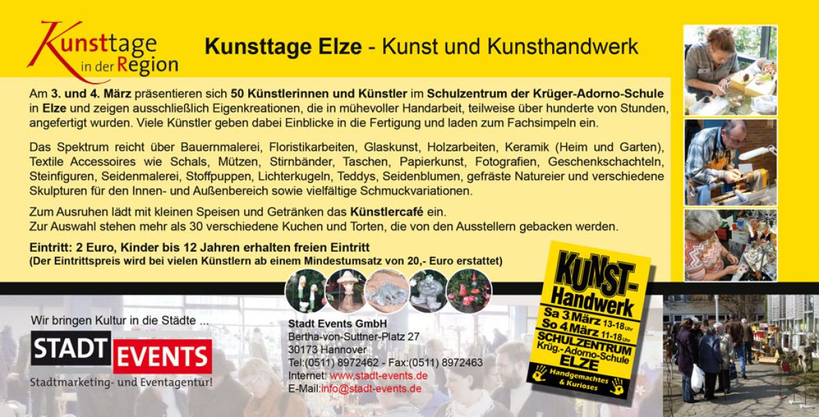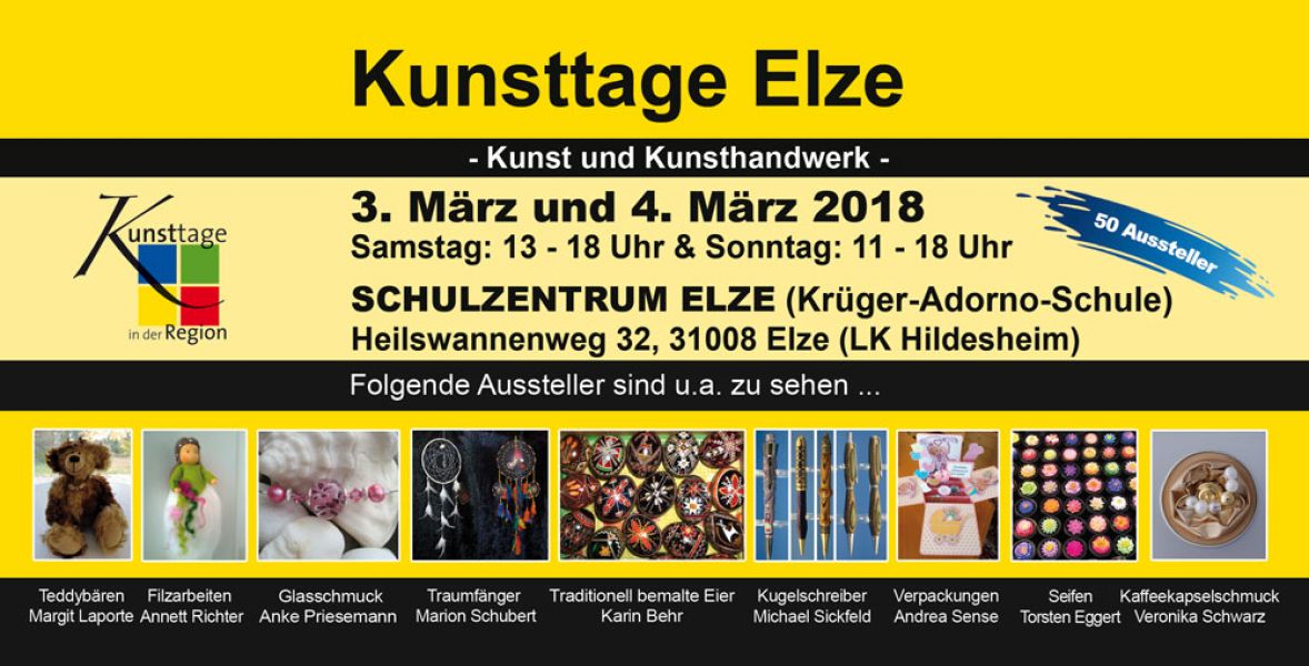 - Bereits zum 9. Mal finden die Kunsttage am 3. und 4. März im Elzer Schulzentrum im Heilswannenweg statt. Innerhalb kürzester Zeit hat sich der Kunsthandwerkermarkt in Elze bei Hildesheim zu einem Geheimtipp in der Region entwickelt. Rund 50 Künstler präsentieren erlesenes und traditionelles Kunsthandwerk kombiniert mit trendigem Design. Schwerpunkte bilden diesmal, passend zum bevorstehenden Frühling, die Themen Garten- und Dekoartikel, farbenfrohe Schmuckkreationen und textile Accessoires. Ort: Schulzentrum Elze (Krüger-Adorno-Schule) Adresse: Heilswannenweg 32, 31008 Elze Termin: 3. und 4. März 2018 Öffnungszeiten: Sa. 13:00 bis 18:00 Uhr und So. 11:00 bis 18:00 Uhr Eintritt: 2 Euro - Kinder frei (bis 12 Jahren) (Der Eintrittspreis wird bei vielen Künstlern ab einem Mindestumsatz von 20 Euro erstattet)