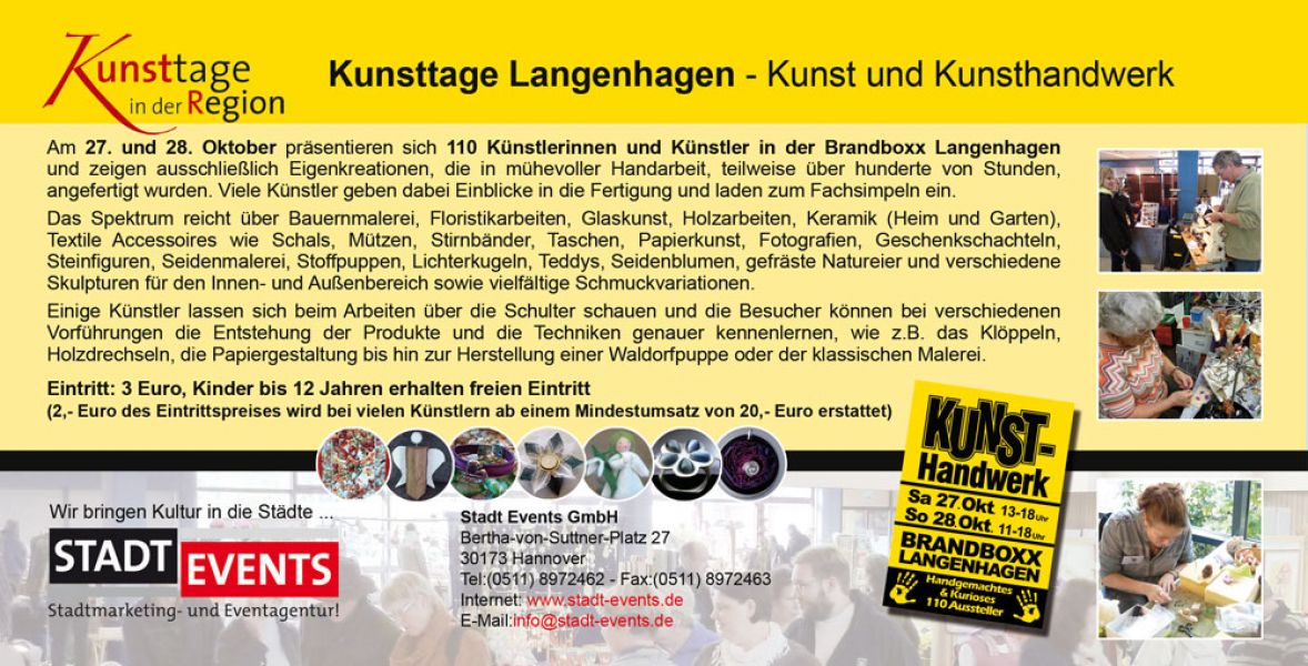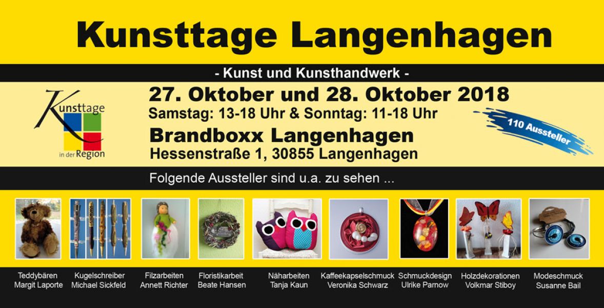 - Kunsttage Langenhagen 2018 – Der Kunsthandwerkermarkt Erstmalig findet einer der größten Kunsthandwerkermärkte in der Region Hannover statt. In der Brandboxx im godshorner Stadtteil von Langenhagen präsentieren sich am 27. und 28. Oktober mehr als 110 Künstler und stellen erlesenes und traditionelles Kunsthandwerk kombiniert mit trendigem Design vor.