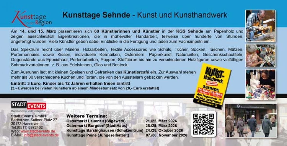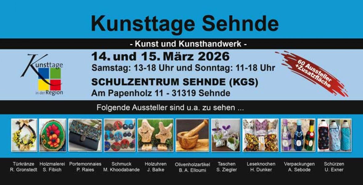 - Am 14. und 15. März lädt die Kooperative Gesamtschule in Sehnde zu einem kreativen Wochenende voller Kunsthandwerk und Design ein. Zahlreiche Ausstellerinnen präsentieren traditionelle Techniken in zeitgemäßer Gestaltung. Im Mittelpunkt stehen filigrane Schmuckkreationen, farbenfrohe Papier- und Dekoarbeiten sowie frühlingshafte und österliche Motive. Zu entdecken gibt es handgefertigte Karten in vielfältigen Designs, detailreiche Perlenarbeiten mit kunstvollen Blüten, fröhliche Häkelstücke wie Taschen und Körbchen sowie außergewöhnliche Kerzen aus verschiedenen Wachsen. Jedes Stück entsteht mit viel Geduld, Präzision und Liebe zum Detail. Besucher können den Künstlerinnen bei Live-Demonstrationen über die Schulter schauen und so den kreativen Prozess hautnah erleben. Ein gemütliches Künstlercafé mit selbstgebackenen Kuchen und Torten lädt anschließend zum Verweilen und Genießen ein und macht den Markt zu einem rundum inspirierenden Erlebnis.