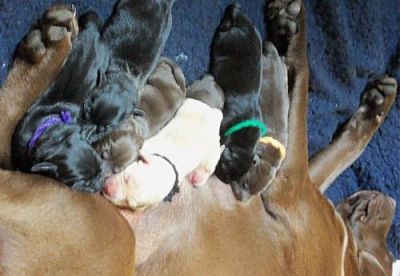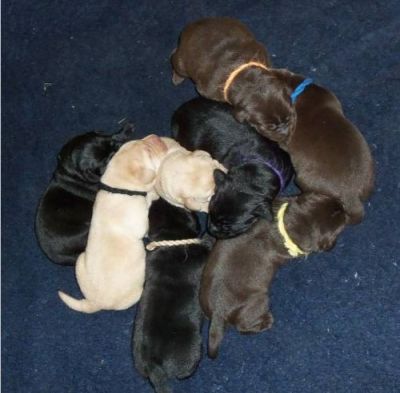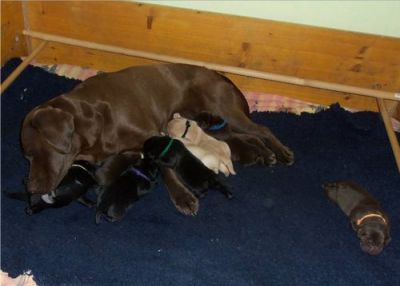 - Für 2 schwarze, 1 braunen und 1 gelben Rüden aus unserem E-Wurf suchen wir noch ein passendes zu Hause! Abgabe der Welpen ist Mitte Juli 2012. Unsere Hunde werden den üblichen Gentesten unterzogen, auf HD/ED geröntgt und nur bei Topwerten zur Zucht eingesetzt. Auch auf Leistungsfähigkeit und bestes Wesen legen wir sehr großen Wert. Unsere Hunde sind hauptsächlich Familienhunde, werden aber artgerecht mit Dummyarbeit und Fährte gefördert. Sie haben maximal 4 Würfe in ihrem Leben und bleiben natürlich auch im Ruhestand in unserer Familie. Auch unsere Welpen wachsen mit uns im Haus auf, können später den Garten erkunden und werden bestens geprägt. Bei der Abgabe ab der 9. Woche sind sie regelmäßig entwurmt, geimpft, gechipt und werden mit Papieren des RHC, einer Grundausstattung und kostenloser Haftpflichtversicherung abgegeben. Bei der Auswahl der neuen Familien nehmen wir uns viel Zeit. Reservierungen sind nur nach einem persönlichen Gespräch/Kontakt (03987 50850) möglich!
