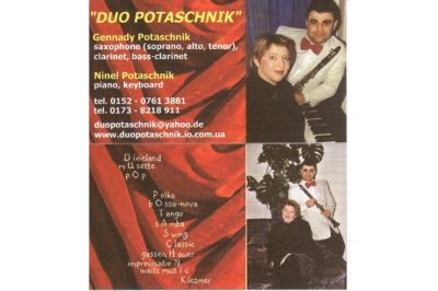 - Planen Sie eine Veranstaltung ? Geburtstagfeier ? Kulturcoctail ? Konzert ? Hochzeit ? Party ? Taufe ? Ausstellung ? Kirchliche Trauung ? Betriebsfest ? Eröffnung eines Restaurants, Clubs oder einer Firma ? Sie wollen jemandem ein besonderes Geschenk machen, die feierliche Atmosphäre verschönern ? Dann ist Duo Ninel (Klavier / E - Piano) und Gennady potaschnik ( Klarinette / Bass-Klarinette, Sopran / Alt / Tenor - Saxophon) dafür die richtige Wahl. Positive Emotionen und gute Laune sind garantiert. Im Repertoire des Duo Potaschnik : Dixieland, Unterhaltungsmusik, Oldies, Soft - Jazz, Blues, Pop, Klezmer, Osteuropäische Folklore etc. Ihr Abend wird zu einem echtem Ereignis und bleibt Ihren Gästen lange Zeit in bester Erinnerung. Das Duo hat grosse Erfahrung auf der Bühne - es gab Konzerte ubd spielte Partys in Ost - und West - Europa, sogar auch in Japan. Rufen Sie an und buchen Sie Duo Potaschnik per Telefon oder per Internet. Kontakt: Gennady Potaschnik - Tel: 0152 /