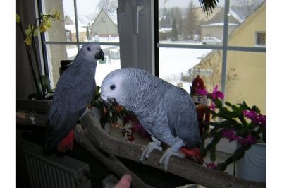 - 2 wunderschöne, junge und zahme Graupapageien Leider müssen wir uns aufgrund einer Allergie meines Mannes von unseren 2 wunderschönen Graupapageien trennen. Es sind 2 Babies , die im Januar 2010 geschlüpft sind. Sie sind geschlossen beringt, DNA, mit allen Papieren und kerngesund. Wir geben sie zusammen in allerbeste Hände mit komplett neuem, großem Käfig komplettem Zubehör (Spielzeug, Futter, Streu, 2 neue Transportboxen etc.). Die beiden sind sehr munter, total neugierig, kommen auf die Hand/Schulter und fangen schon an zu sprechen und zu imitieren - es sind sehr, sehr liebe Vögel, die in wirklich liebevolle Hände kommen sollen. Bitte nur ernstgemeinte Anfragen bitte per E-Mail.