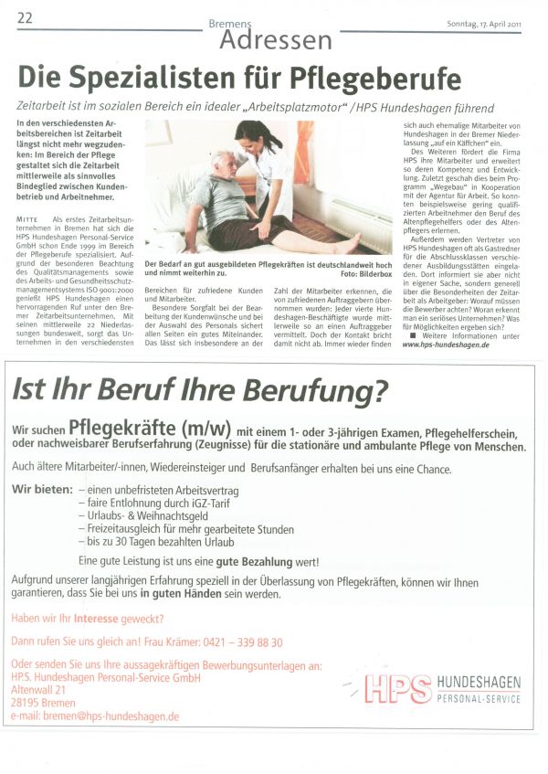 - Wir suchen Pflegefachkräfte (m/w) für den stationären Altenpflegebereich. Mit einem 3-jährigem Examen, bzw. Ihrer Anerkennung in der Pflege, können Sie sofort bei uns anfangen. Bereits Ende 1999 haben wir uns als erstes Zeitarbeitsunternehmen in Bremen auf den Pflegebereich spezialisiert. Auch ältere Mitarbeiter/Innen, Wiedereinsteiger und Berufsanfänger (mit entsprechender Qualifikation) erhalten bei uns eine Chance. Die wichtigste Voraussetzung für unser alteingesessenes Team ist Zuverlässigkeit, Flexibilität und die richtige Einstellung zur Zeitarbeit. Bei uns erhalten Sie: * einen unbefristeten Arbeitsvertrag * faire Entlohnung durch iGZ-Tarif + Zulagen * Urlaubs- & Weihnachtsgeld * bis zu 30 Tage bezahlten Urlaub * sog. „Pflegeteamrunden/ Supervision“ * einen monatlichen Dienstplan * das Wissen, in einem anerkannten Team mitwirken zu dürfen * und einen Stundenlohn, der Sie überraschen wird! Eine gute Leistung ist uns eine gute Bezahlung wert! HPS - Tel.: 0421 339 88 30