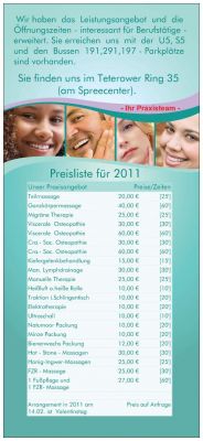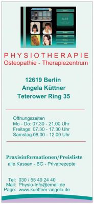 - Informationen aus unserer Praxis. Wir wünschen unseren Patienten einen guten Start ins neue Jahr Suchen Sie ein schönes Geschenk? Wie wäre es mit einem Geschenkgutscheinfit und entspannt in's Neue Jahr mit einer Massge in unserer Praxis? Auf unserer Internetseite finden Sie schöne Geschenkideen :http://www.kuettner-angela.de Für Fragen und wünschen stehen wir Ihnen gern zur Verfügung unsere TeL: 030/55 49 24 40 Vertrauen und Verständnis - Bei uns sind Sie in kompetenten Händen! Seit mehr als dreißig Jahren biete ich ein breites Behandlungsspektrum von der Prävention bis zur Rehabilitation, vom Säugling bis ins hohe Alter. Fort-&Weiterbildung hat bei uns oberste Priorität. Sie können darauf vertrauen, dass Sie nach den neuesten Erkenntnissen der Physiotherapie behandelt werden. Unsere Philosophie ist es •Ihre Gesundheit zu fördern •Ihre Beschwerden zu lindern •Ihnen größtmögliche Selbstständigkeit im Alltag zu ermöglichen Sie erreichen uns mit der U5,S5 und den Bussen 191,291,197