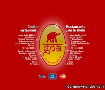 - . El restaurante GOA ® despertará también tu gusto por la exótica y deliciosa comida de la India en un ambiente informal, pero muy agradable. GOA ®... un sabor de la India López Cotilla 1520-A (a dos cuadras del Consulado de Estados Unidos, entre Marsella y Chapultepec) Colonia Americana 44140 Guadalajara, Jal. México (33) 3615 6173 Martes a sábado: 13 a 24 h Domingo: 13 a 19.30 h Lunes: cerrado MasterCard, Visa y Visa Electron Para ver menú y bebidas, favor de copiar y pegar: [URL]http://www.goa-restaurantes-guadalajara.com[/URL] .