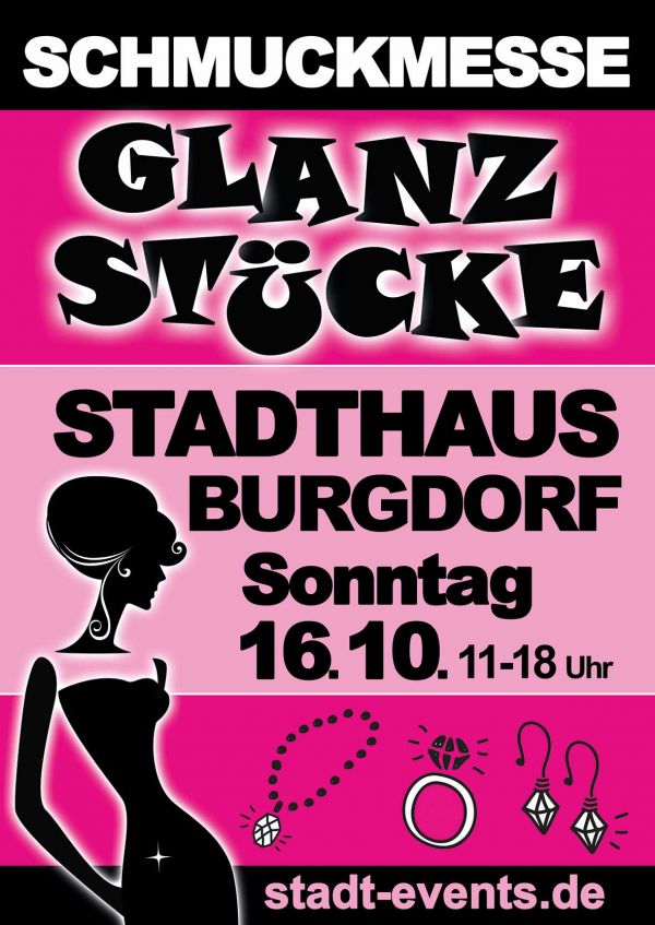 - Shine bright like a diamond! Auf der Messe „Glanzstücke“ im Burgdorfer StadtHaus dreht sich am Sonntag, den 16. Oktober, in der Zeit von 11-18 Uhr alles um das Thema Schmuck in den vielfältigsten Variationen. Aussteller aus ganz Deutschland präsentieren Unikate, Kleinserien und Trends von übermorgen, egal ob glamourös, modisch, ausgefallen oder einfach zeitlos, für jeden Geschmack und Anlass ist etwas dabei. Einige Aussteller geben dabei Einblicke in die spezielle Fertigung und der verwendeten Materialien. Veranstaltung: Schmuckmesse „Glanzstücke“ Veranstaltungsort: StadtHaus Burgdorf Adresse: Sorgenser Str. 31, 31303 Burgdorf Termin: 16. Oktober 2016 Öffnungszeiten: 11 - 18 Uhr Eintritt: 3€
