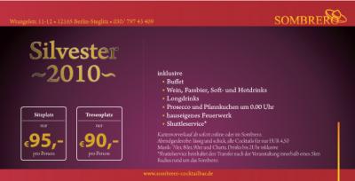 - Die ultimative Silvesterparty 2010 im Sombrero inklusive • Buffet • Wein, Fassbier, Soft- und Hotdrinks • Longdrinks • Prosecco und Pfannkuchen um 0.00 Uhr • hauseigenes Feuerwerk • Shuttleservice* für nur ab 90 €/pro Person mehr Info unter 030/797 43 409 tgl. ab 16.00 Uhr oder unter www.sombrero-cocktailbar.de
