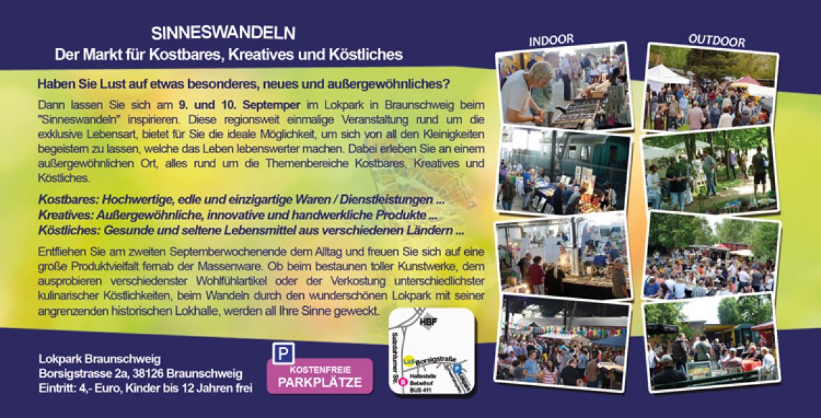 - Am 9. und 10. September präsentieren sich Aussteller aus ganz Deutschland beim 'Sinneswandeln' im Lokpark Braunschweig. Mit dem idyllischem Lokpark und der historischen Halle erzeugt der Veranstaltungsort eine beeindruckende Atmosphäre bei Jung und Alt. Diese regionsweit einmalige Veranstaltung rund um die exklusive Lebensart, bietet einen idealen Schauplatz, um sich von all den Kleinigkeiten begeistern zu lassen, welche das Leben lebenswerter machen. Dabei erfahren die Besucher alles rund um die Themenbereiche Kostbares, Kreatives und Köstliches. Wer träumt nicht von einer wunderschönen, romantischen Sitzgelegenheit für Zuhause? Seit mehr als drei Jahrzenten fertigt die Korbmanufaktur aus Friedrichstadt Standkörbe in typisch friesischer Form. Die Strandkörbe sind durch ihre Verstellbarkeit und Erweiterungen individuell an ihre Besitzer anpassbar. Bei einer Auswahl von mehr als 300 verschiedenen Stoffen, die aus unterschiedlichen Ländern stammen, kann bis zur Fertigstellung persönlic